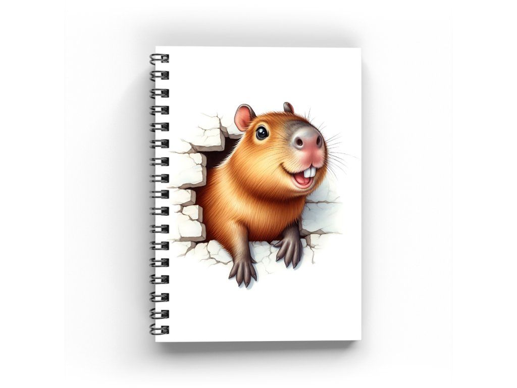 Laminované desky chrání sešit před opotřebením a zároveň dodávají elegantní vzhled. Povrch je odolný a snadno se udržuje, takže sešit vydrží každodenní používání. Veselý motiv kapybary vylézající ze zdi.