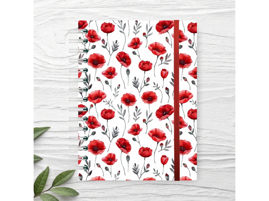 Kroužkový sešit A5 linkovaný – vlčí máky pevné desky | gumička | recyklovaný papír | 80 stran