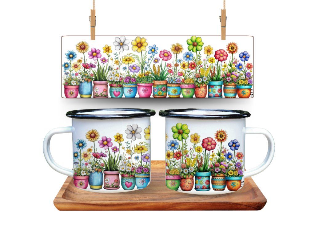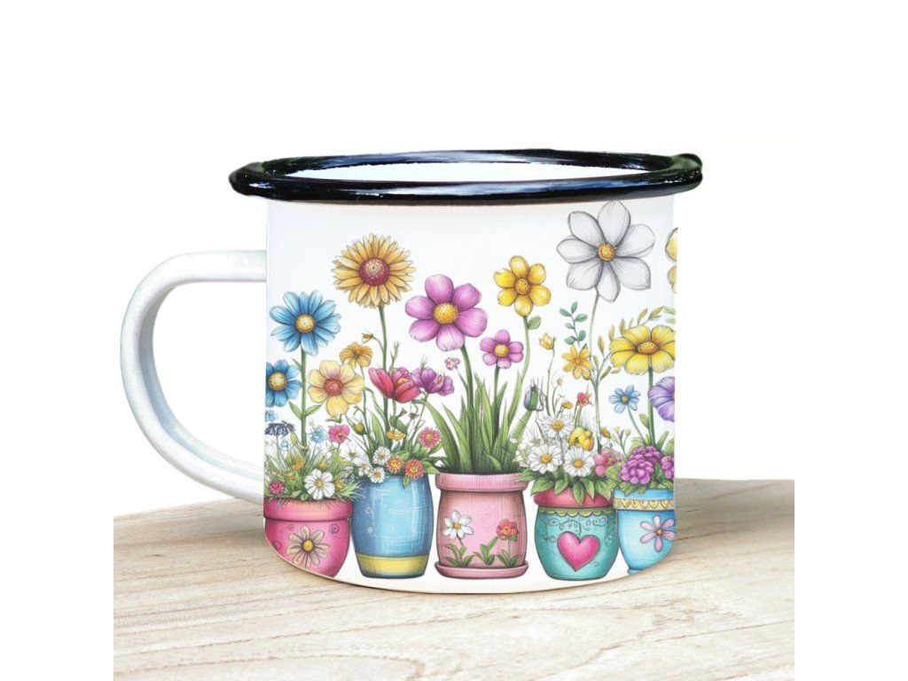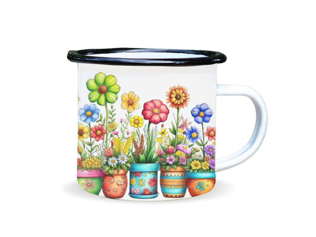 Plecháček s potiskem barevných květin v květináčích je lehký, odolný a ideální na cesty, výlety i každodenní použití. Skvěle se hodí na kávu, čaj i jiné nápoje doma i venku.