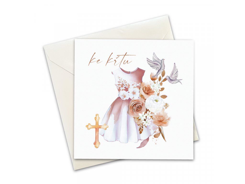 Přáníčko ke křtinám holčičky má čtvercový formát 14,5 × 14,5 cm a jsou vyrobena z kvalitního papíru o gramáži 250 g.