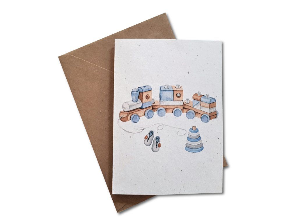 Přáníčko s vláčkem má formát A6 10,5 × 14,8 cm a jsou vyrobena z kvalitního papíru o gramáži 250 g.
