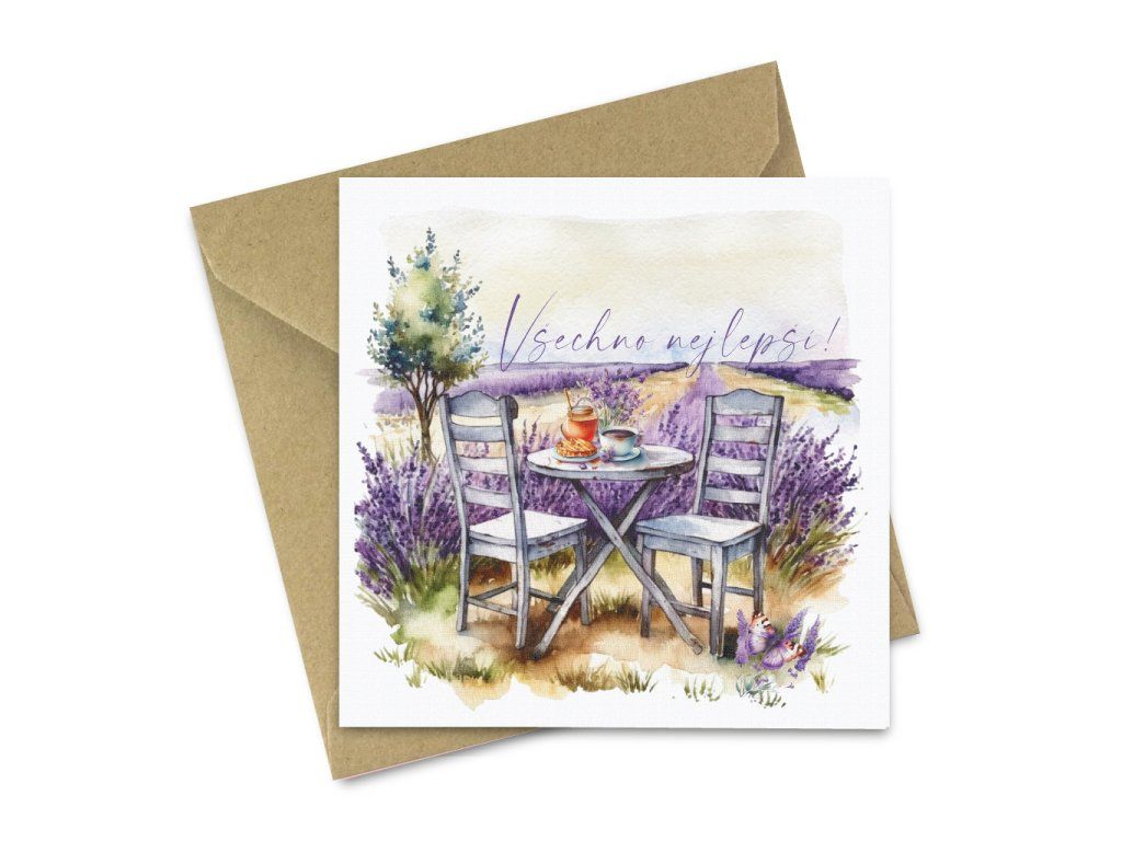 Přáníčko s levandulí má čtvercový formát 14,5 × 14,5 cm a jsou vyrobena z kvalitního papíru o gramáži 250 g.