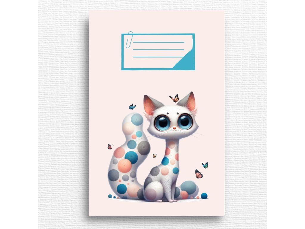 Roztomilý školní sešit s motivem barevné kočičky, potěší všechny děti, které mají rády zvířátka a hravé ilustrace.