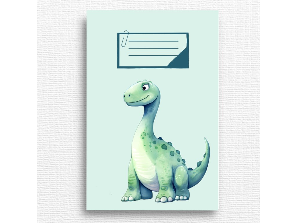 Roztomilý školní sešit s motivem dinosaura, potěší všechny děti, které mají rády zvířátka a hravé ilustrace.