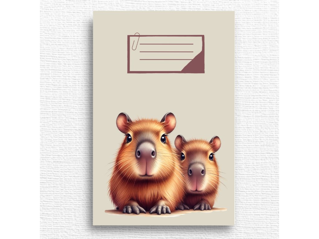 Roztomilý školní sešit s motivem kapybary, potěší všechny děti, které mají rády zvířátka a hravé ilustrace.