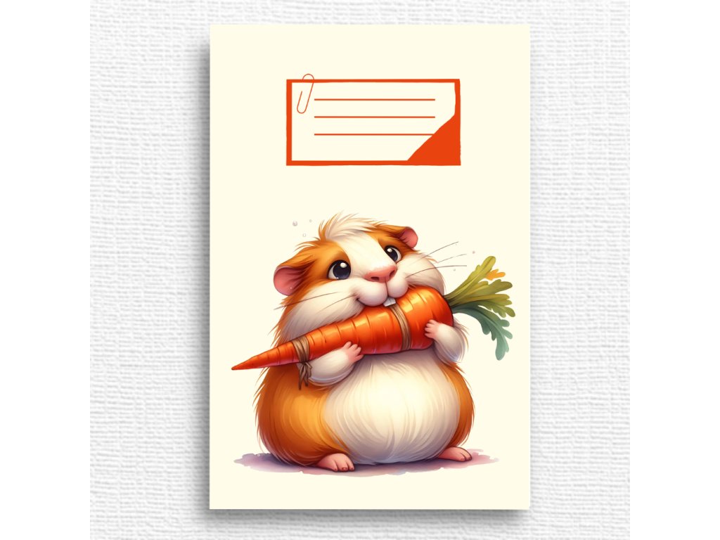 Roztomilý školní sešit s motivem morčete s mrkví, potěší všechny děti, které mají rády zvířátka a hravé ilustrace.