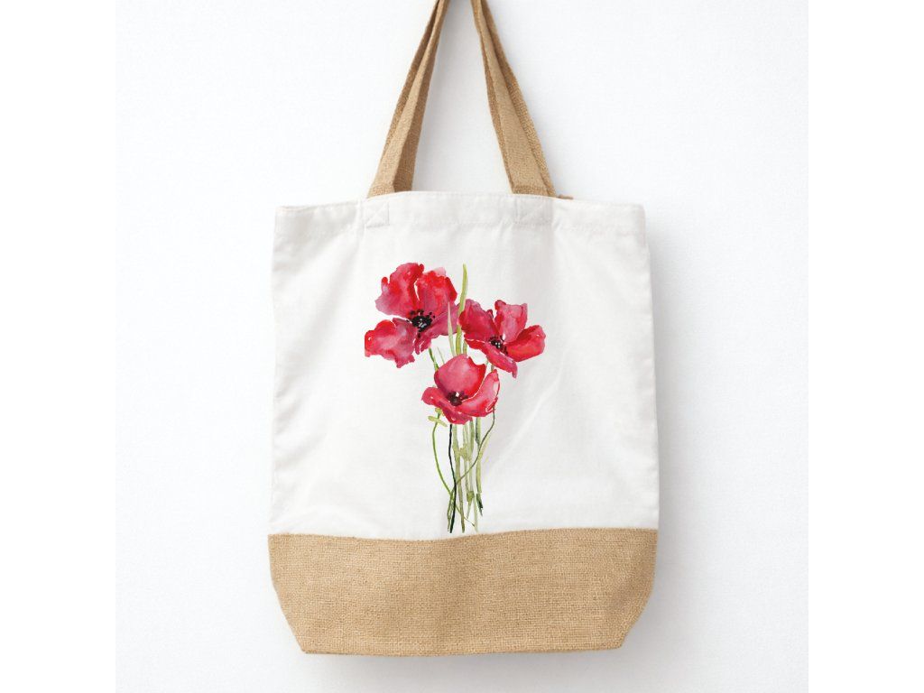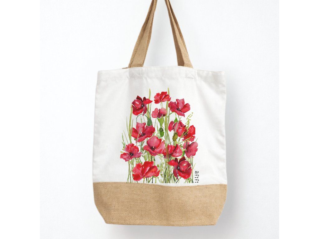 Nákupní taška s pevným jutovým dnem s potiskem vlčích máků je ideálním společníkem na léto, dovolenou i výlety i nákupy.